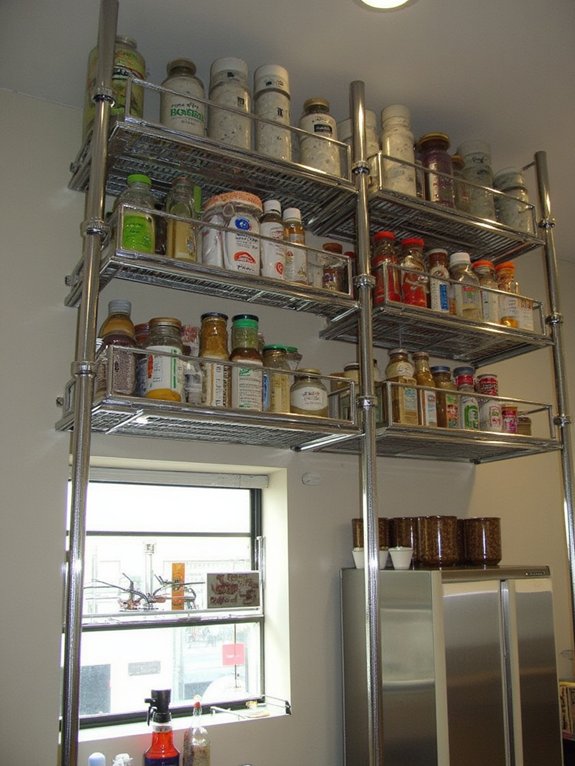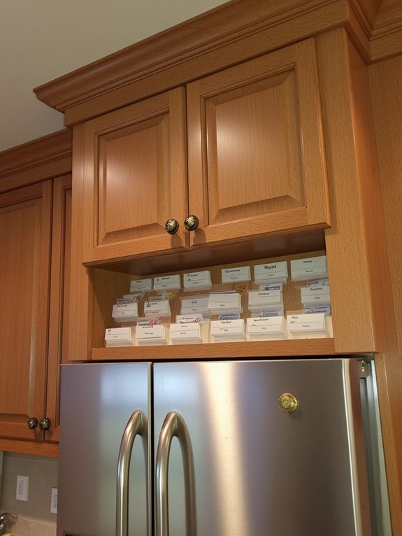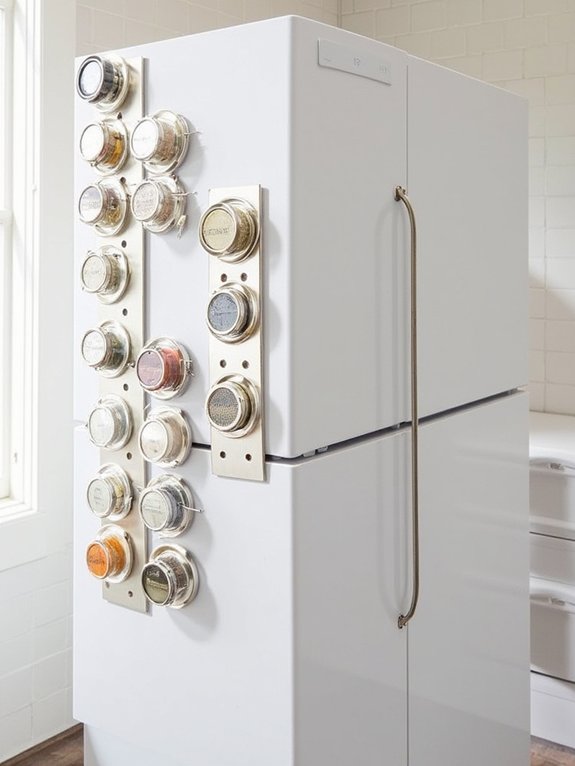 A magnetic spice container rack mounted above the refrigerator maximizes unused vertical space while keeping spices organized and accessible. The system uses small magnetic containers with clear lids that attach securely to a metallic panel, allowing for easy spice identification and retrieval during cooking.