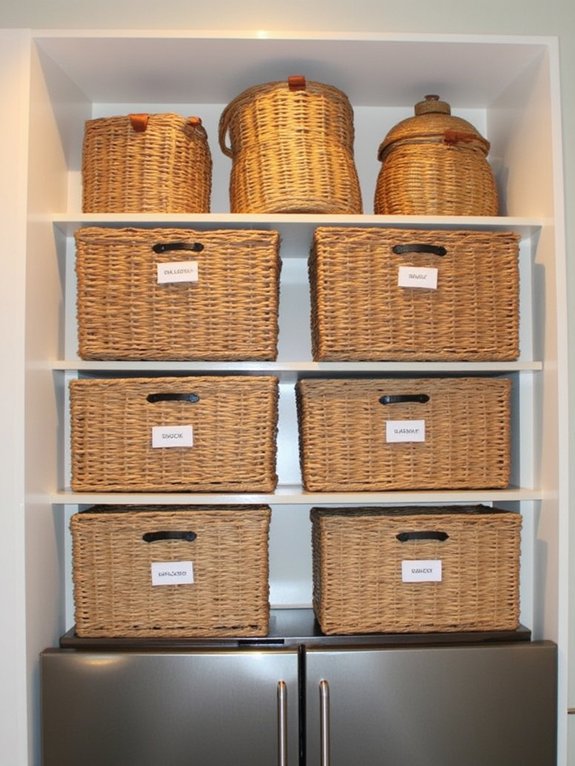A decorative basket storage system above the refrigerator transforms unused vertical space into functional storage while adding visual interest to your kitchen. The system utilizes durable woven materials like seagrass, water hyacinth, or bamboo baskets that can handle regular use.