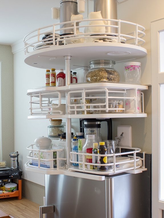 A rotating corner storage unit maximizes typically wasted space while ensuring easy access to stored items. By installing a turntable mechanism with adjustable shelving tiers, this solution transforms awkward corners into functional storage areas.