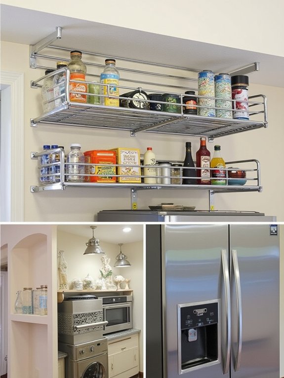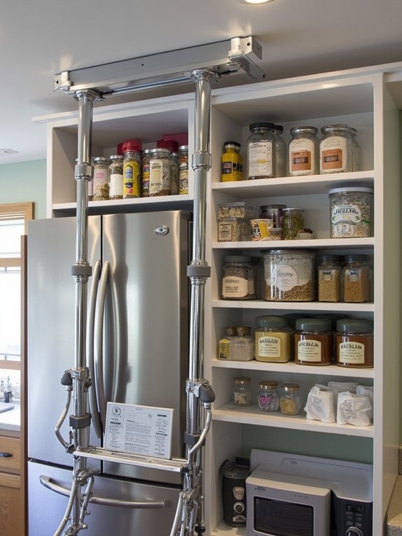 The pull-down storage ladder provides a safe way to reach items stored in high kitchen spaces, particularly above refrigerators. This retractable system supports up to 300 pounds and folds flat against the wall when not needed, taking minimal space.