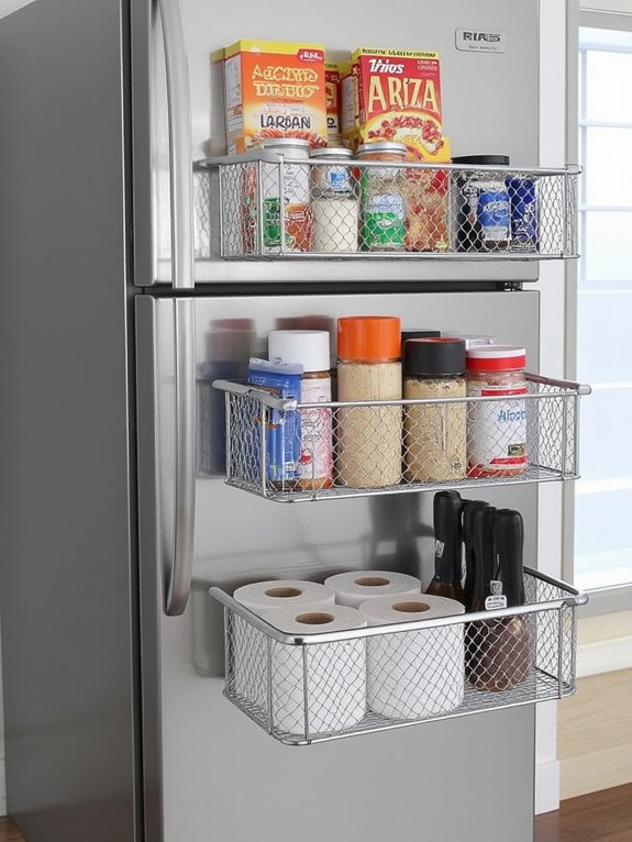 The basket’s metal mesh construction offers durability and ventilation, supporting weights up to 20 pounds when properly installed 6 inches above the refrigerator. This versatile storage solution accommodates various household items from cleaning supplies to paper products, making efficient use of vertical space while maintaining accessibility.