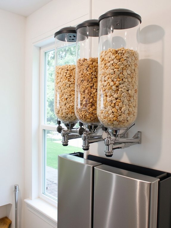 Each unit comes with professional mounting hardware and precise portion control mechanisms, accommodating up to 17.5 ounces of dry cereal per dispenser. The modular design allows for multiple dispensers to be installed side by side, creating an efficient breakfast station that saves counter space while keeping cereals readily accessible.