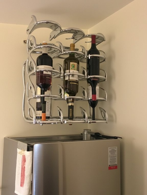 A vertical wine bottle organizer provides an efficient storage solution for unused space above refrigerators, accommodating 6-12 bottles in an attractive, accessible arrangement. This vertical configuration maximizes available room while keeping wine bottles neatly organized.