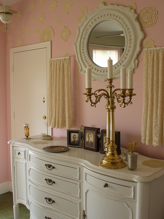 Brass candelabras paired with vintage lace create an elegant, old-world atmosphere in nursery designs. The brass fixtures cast warm shadows across the room while delicate lace accents add sophisticated texture through curtains and bedding details.