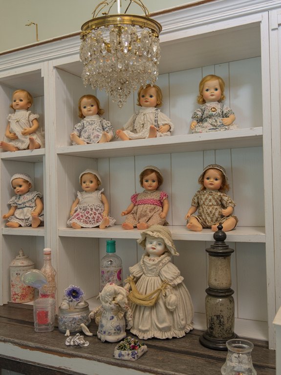 Porcelain baby dolls from the early 1900s serve as charming display pieces in vintage nursery designs. These delicate heirlooms require proper care and protection, typically housed in enclosed glass cases to prevent dust damage and preserve their original condition.