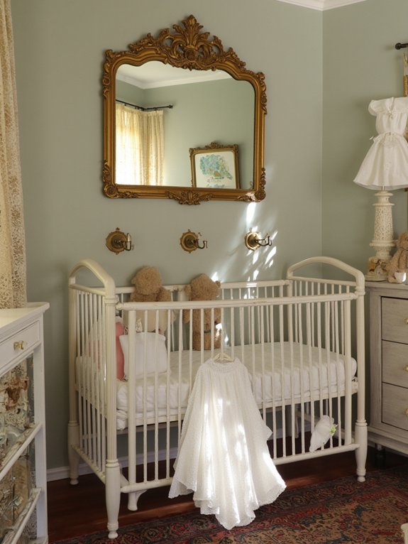 Antique Victorian mirrors with ornate gold frames serve as both functional and decorative elements in vintage-style nurseries. These statement pieces feature intricate scrollwork, delicate leaf patterns, and hand-carved wooden frames finished in gold leaf, creating an heirloom quality that enhances the room’s elegant aesthetic.