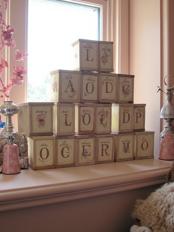 Faded floral alphabet blocks combine educational function with vintage-inspired design, featuring delicate botanical illustrations and letters on weathered wooden cubes. The blocks showcase soft, pastel-colored roses, peonies, and lilacs that complement classic nursery decor.