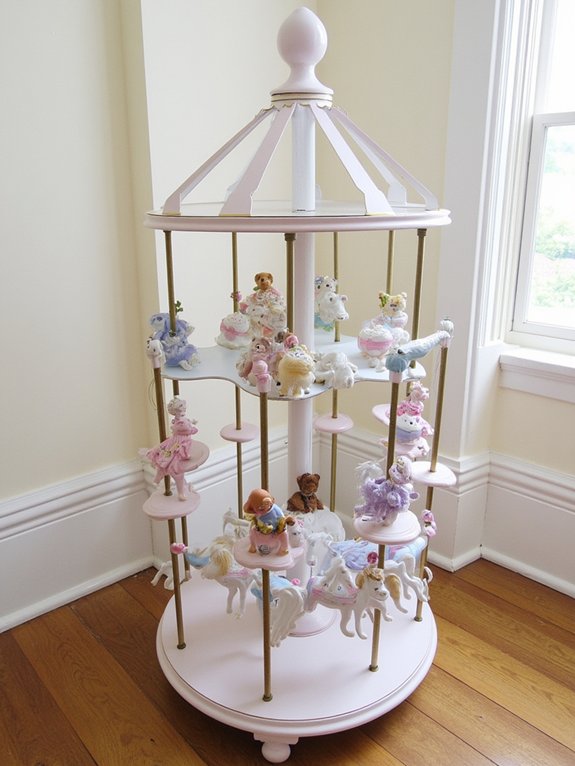 The vintage carousel display stand combines decorative charm with functional storage, featuring multiple tiers adorned with hand-painted carousel horses. This nostalgic centerpiece showcases nursery keepsakes and toys while capturing the whimsical spirit of classic merry-go-rounds.
