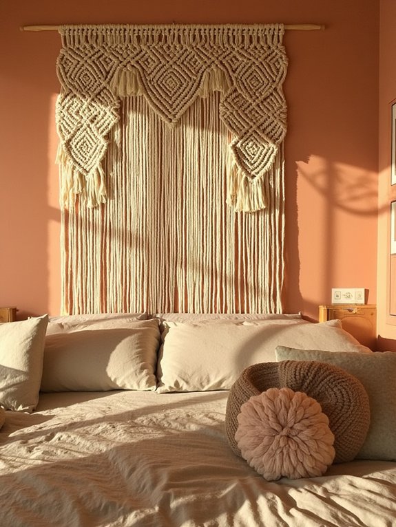 A handmade macramé wall hanging brings bohemian flair and eye-catching texture to bedroom walls. Created using natural cotton rope in various thicknesses, these woven pieces transform empty spaces into artistic focal points, especially when positioned above beds or dressers.