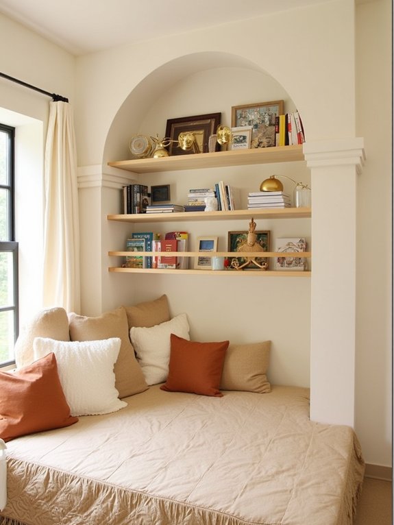 Create a welcoming reading retreat by installing a wall-length nook with built-in shelving and comfortable seating. The design should include plush bench cushions with washable covers, adjustable LED reading lights, and under-seat storage drawers for blankets and books. Add visual and tactile interest with an assortment of throw pillows in different textures.