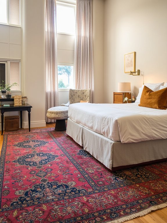 Persian carpet borders showcase intricate patterns and ornate designs that have been treasured for generations. These vintage pieces feature meticulous craftsmanship with detailed motifs, geometric shapes, and flowing arabesques that create visual depth and sophisticated style in bedroom spaces.
