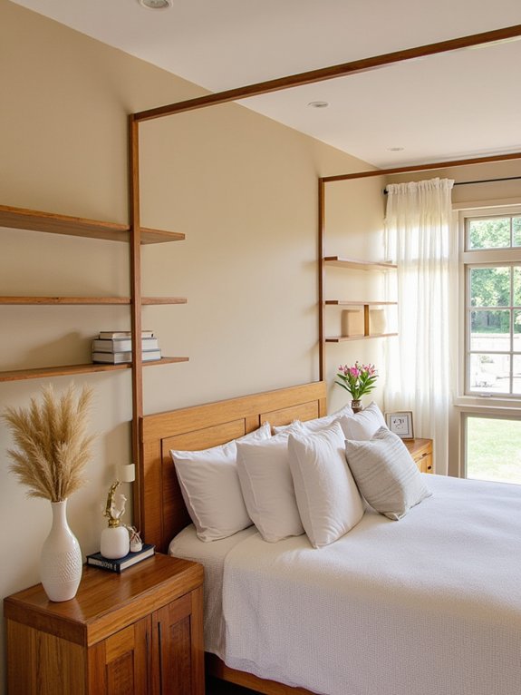 Floating bedside storage shelves provide a space-saving solution that combines modern aesthetics with practicality. These wall-mounted units eliminate the need for traditional nightstands while maintaining easy access to essential items and creating an open, uncluttered look in the bedroom.