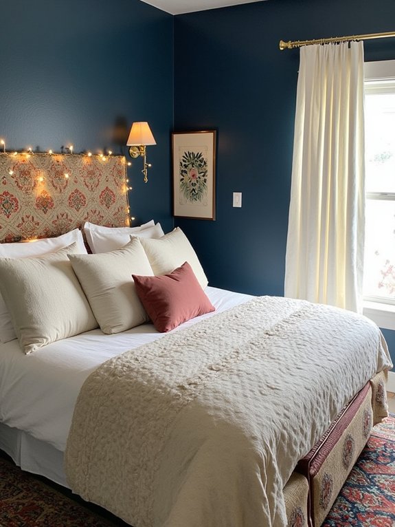 Midnight blue walls transform a bedroom into a tranquil sanctuary, creating a cocooning effect that promotes relaxation and restful sleep. This sophisticated color choice establishes a calming atmosphere that transitions seamlessly from daylight to evening hours.