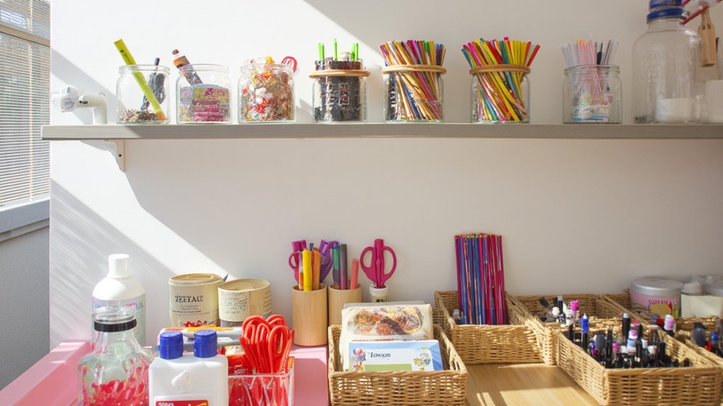 Setting up accessible art supplies is a key step in a Montessori-inspired kids’ bedroom to foster creativity. You’ll want to make art materials easy to reach and use anytime inspiration strikes. Place them at your child’s height, around 2-3 feet off the ground, for independent access.