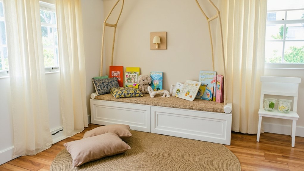 Crafting a child-sized reading nook can transform a corner of your kid’s Montessori-inspired bedroom into a cozy haven. You’ll create a space that encourages independent reading with just a few steps over a weekend.