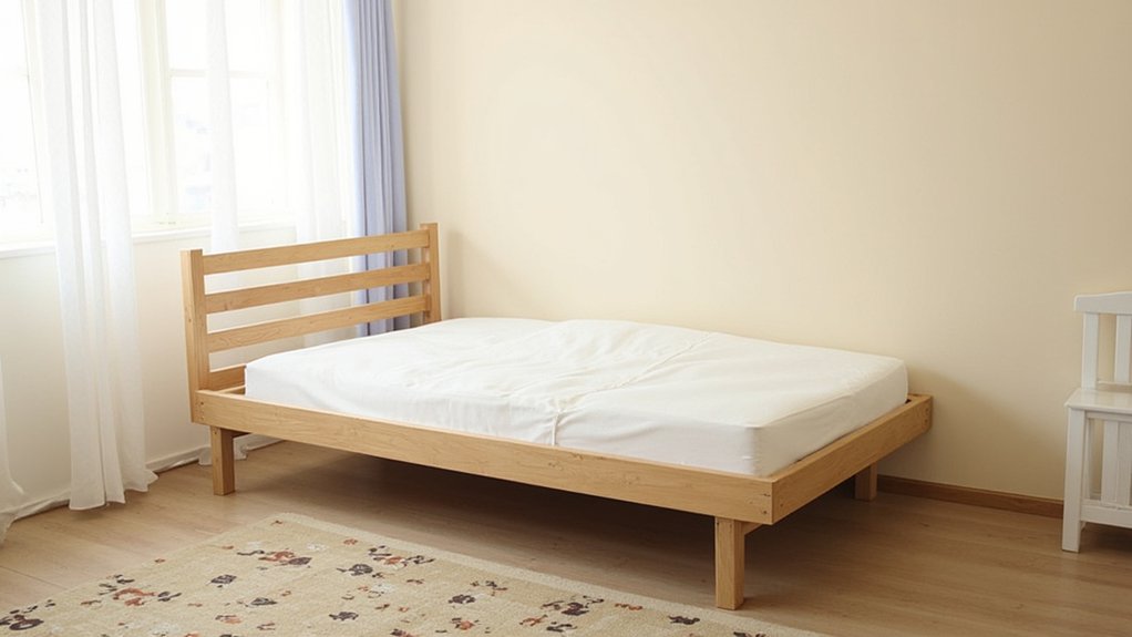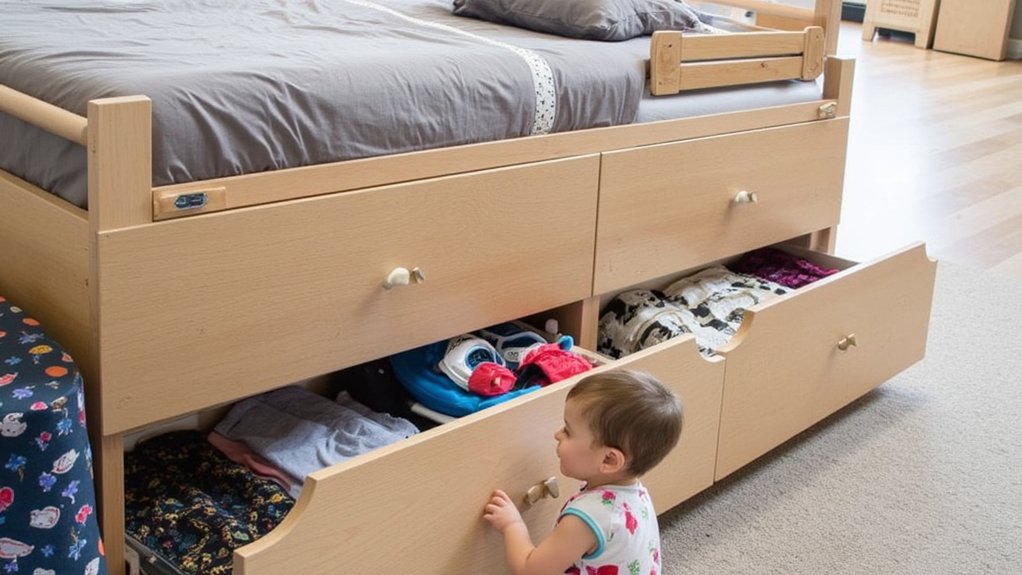 Let’s shift from adding personal touches like name decals to maximizing space with under-bed storage drawers. These drawers keep your child’s Montessori-inspired bedroom tidy and functional, promoting independence. You’ll save floor space while teaching organization.