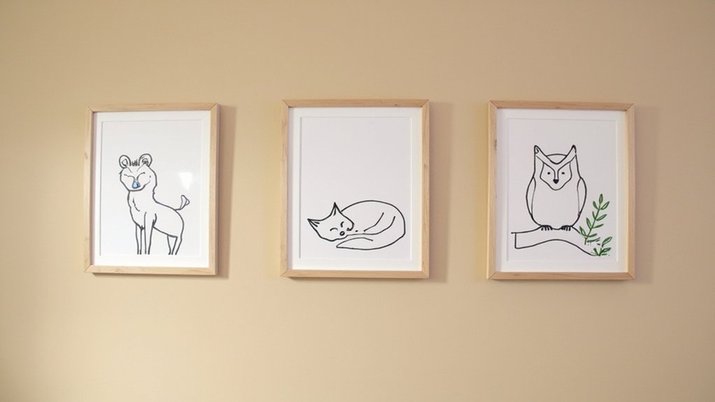While designing a Montessori-inspired kids’ bedroom, you’ll want to focus on minimalist wall art that encourages calm and creativity. Keep decorations simple, avoiding clutter that overwhelms the space. Choose pieces that inspire your child’s imagination without distraction.