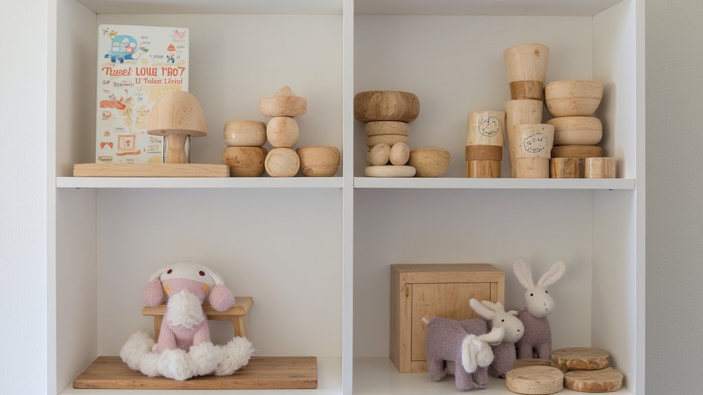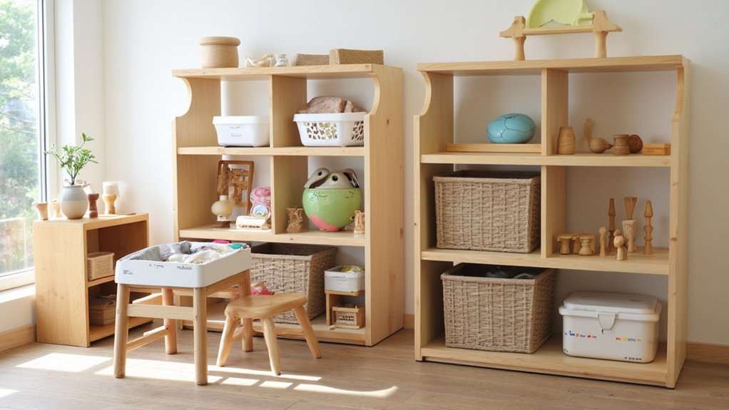 Let’s move from organizing art supplies to setting up open play shelves that encourage independent exploration in a Montessori-inspired bedroom. You’ll want shelves at your child’s height, about 24-36 inches tall, for easy access. Install them within a week to build routine.