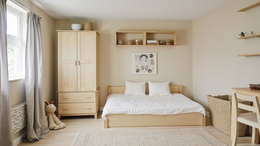 As you craft a Montessori-inspired bedroom for your child, consider the calming impact of a neutral color palette. Neutral tones like beige, soft gray, and creamy white create a serene space, promoting focus and rest. They’re versatile too, blending with natural wood furniture for that Montessori vibe. Let’s explore key colors to use: