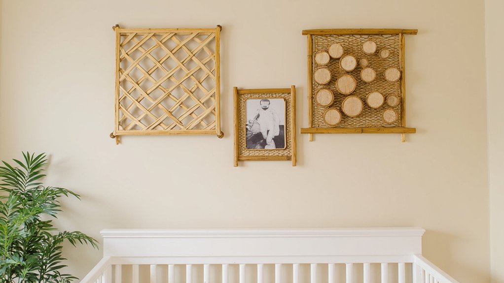 As you shape your nursery’s cozy vibe, consider adding bamboo wall decorations for a natural, serene touch. They’re lightweight, eco-friendly, and bring a calming warmth to the space. Hang them in about 30 minutes with minimal tools.