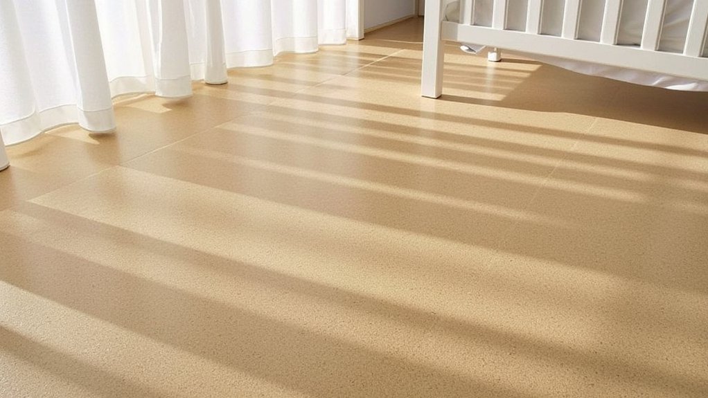 As you craft an eco-friendly nursery, consider installing sustainable cork flooring for a warm, natural foundation. It’s durable, soft underfoot, and harvested from renewable cork oak trees without harming them. You’ll love its natural insulation, keeping the room cozy year-round, with installation taking about 2-3 days for a 10×10-foot space.