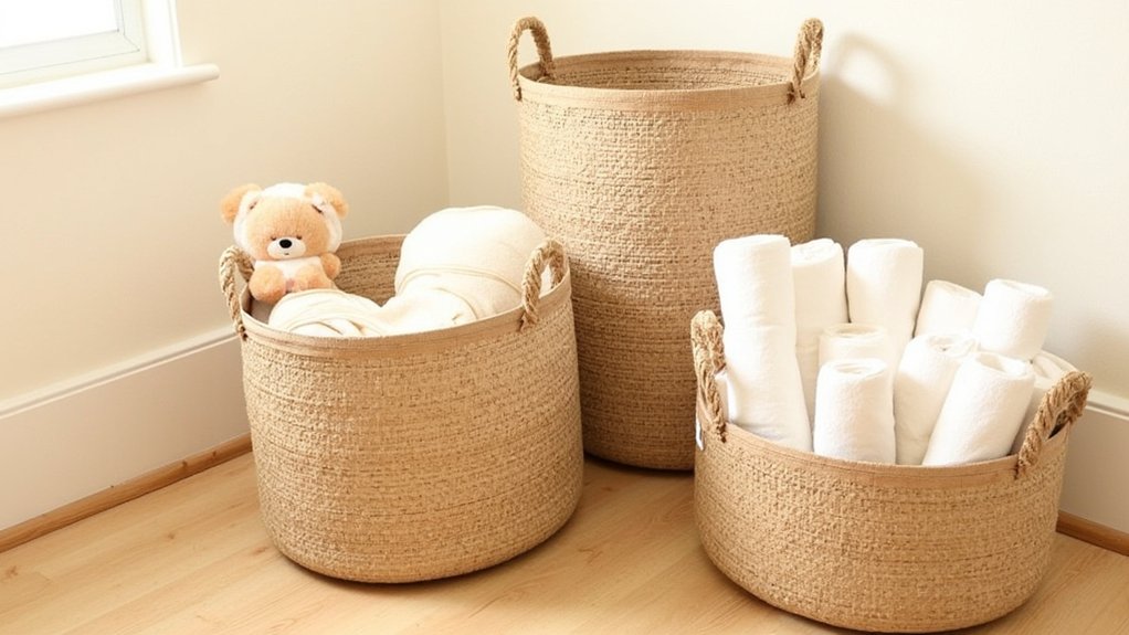 Thoughtful storage sets the tone for an organized, eco-friendly nursery with biodegradable jute baskets. You’ll love how these natural, durable options keep clutter at bay while blending seamlessly with organic decor. Opt for baskets around 12-15 inches wide to store toys, diapers, or blankets efficiently.