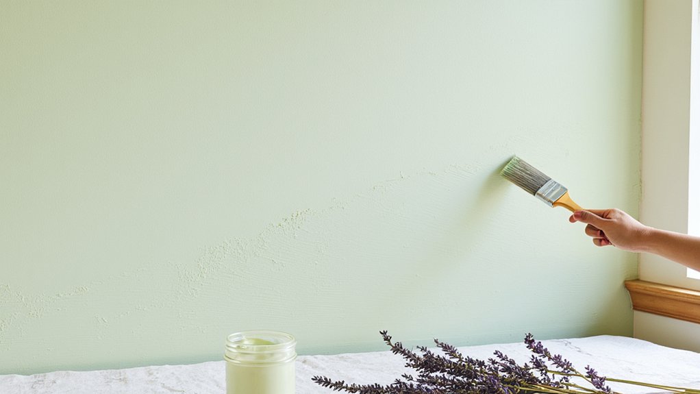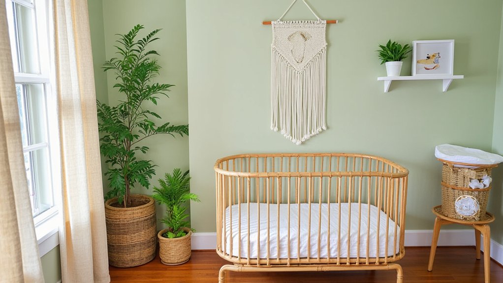 While designing your nursery with organic elements, consider switching to plant-based paint finishes for a safe, eco-friendly touch. These paints, made from natural ingredients like soy or milk, avoid harmful chemicals. You’ll breathe easier knowing your baby’s space is toxin-free with low-VOC options.