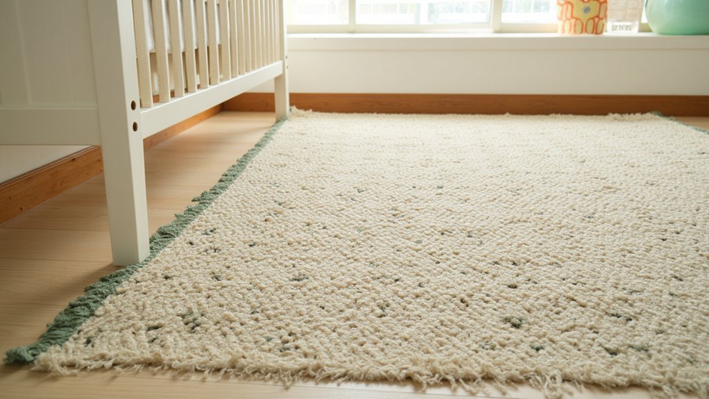 Plunge into the cozy world of eco-friendly wool rugs to enrich your nursery’s organic design. You’ll love how these sustainable pieces add warmth and texture underfoot. Choose a rug that’s 5×7 feet for a small nursery, ensuring it fits under the crib within 30 days of setup.
