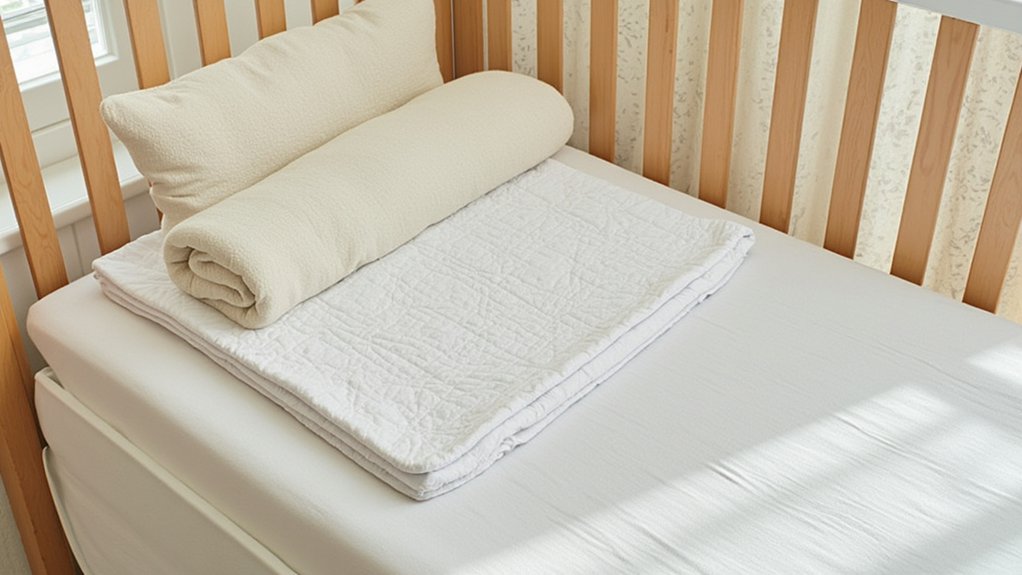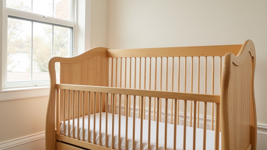 While designing a nursery with organic elements, starting with a natural wood crib sets the perfect foundation. You’re creating a safe, earthy space for your baby with a crib that’s sturdy and untreated. Pick one made of solid oak or maple, ideally 54 inches long and 30 inches wide, to fit standard spaces.