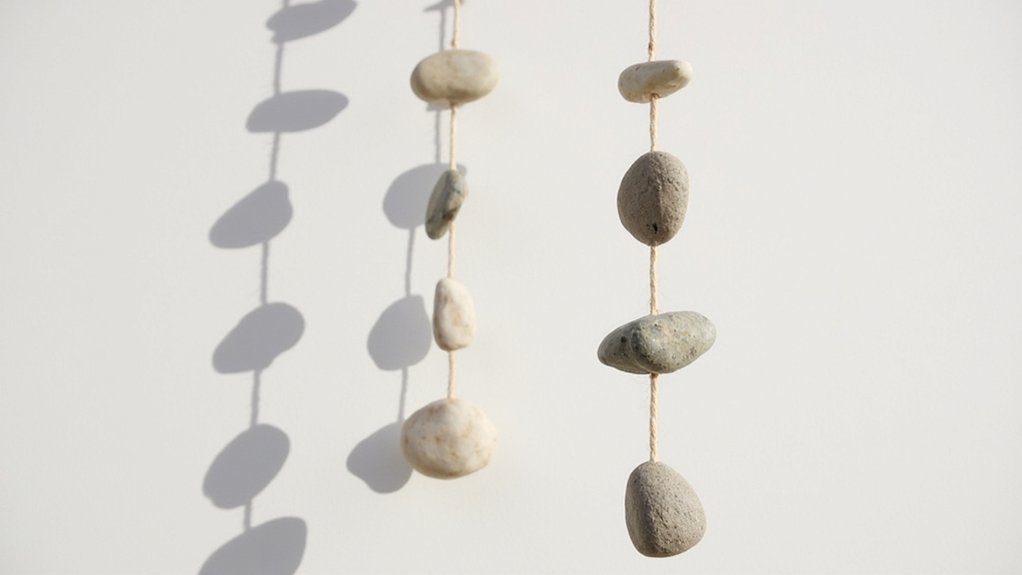 - Earthy brown river rocks dangling in rhythmic patterns.