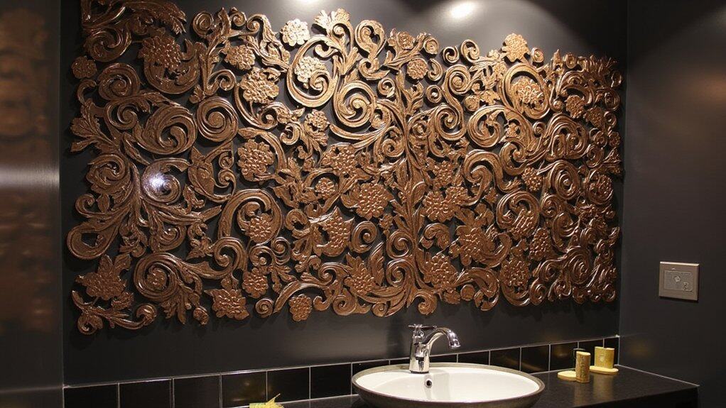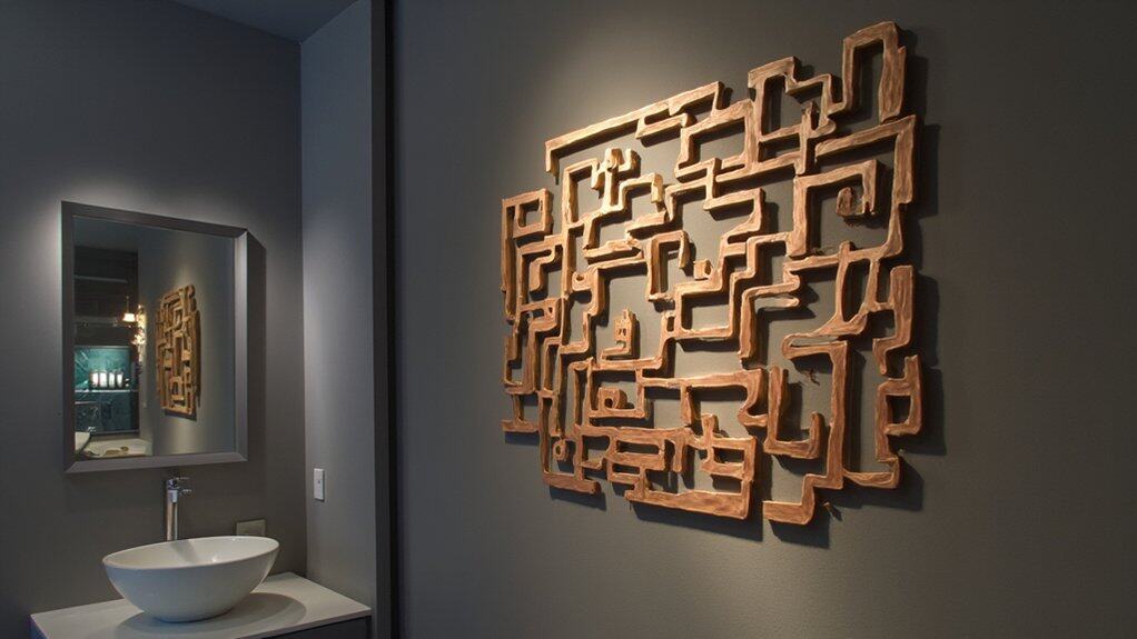 As you explore more ways to elevate your powder room, consider adding sculptural wall art for a striking, three-dimensional effect. These pieces add depth, and they’re perfect for small spaces. Hang a metal or wooden sculpture, ideally 12-18 inches wide, above the sink for impact.