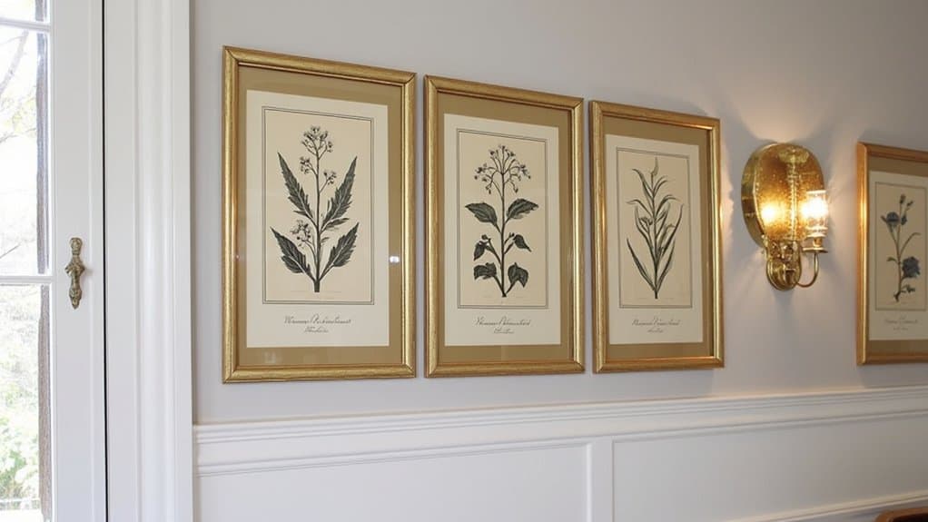 Moving from bold mural wallpaper, let’s explore another way to personalize your powder room with framed vintage prints. These timeless pieces add charm and history to your small space. You can find them at flea markets or online shops, often for under $20 each.