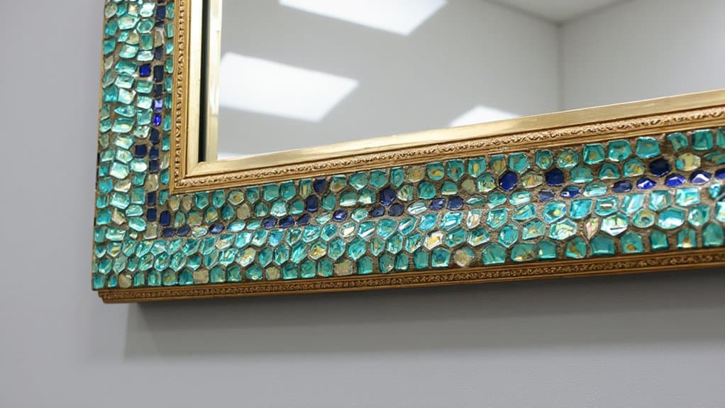 Transforming your powder room with a mosaic mirror frame brings a splash of color and personality to the space. You can create this stunning focal point with small tiles (1-2 inches) and a basic mirror (24×36 inches). Set aside 4-6 hours over a weekend for this project.