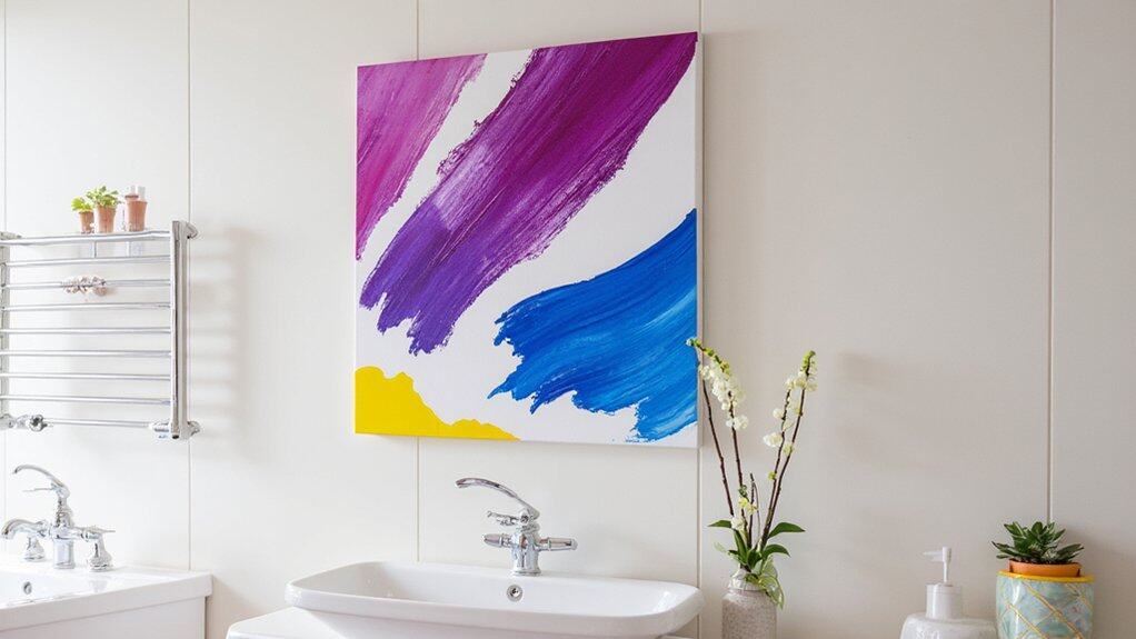 How can you bring a burst of energy to your powder room with minimal effort? Hang a colorful abstract canvas art piece! Pick a vibrant 24×36-inch canvas to fit above the sink, taking just 10 minutes to install with a hammer and nails.