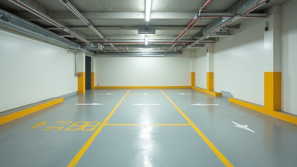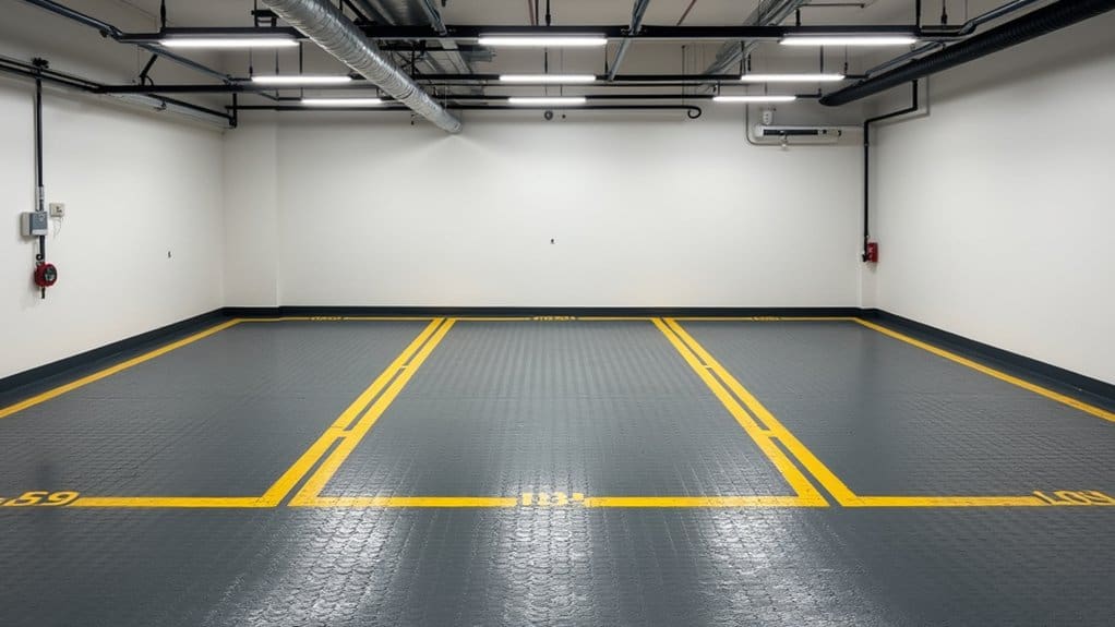 Adding floor tile markings to a three-car garage is an effective way to maintain organization and designate specific parking or storage areas for each vehicle and item. Begin by thoroughly cleaning the garage floor to remove dirt, oil, and debris, guaranteeing the tiles or paint will adhere properly. Choose durable, interlocking floor tiles or use epoxy paint with stencils to create clear, visible markings for parking zones or pathways.