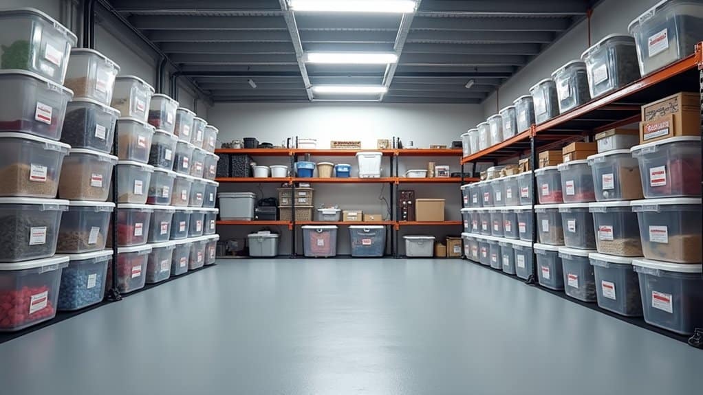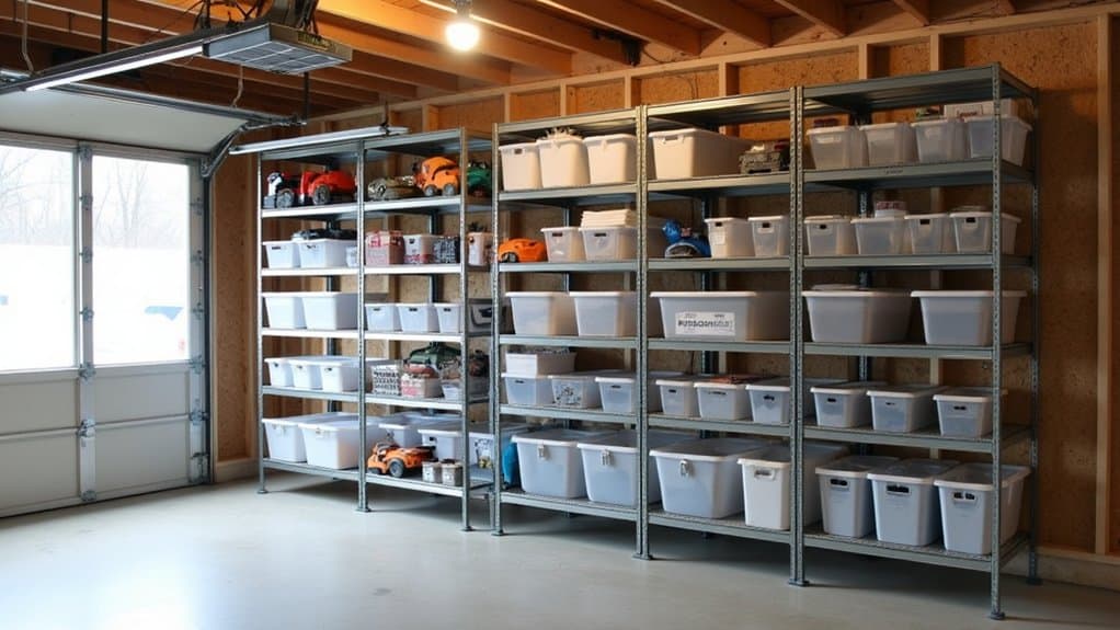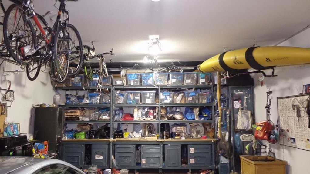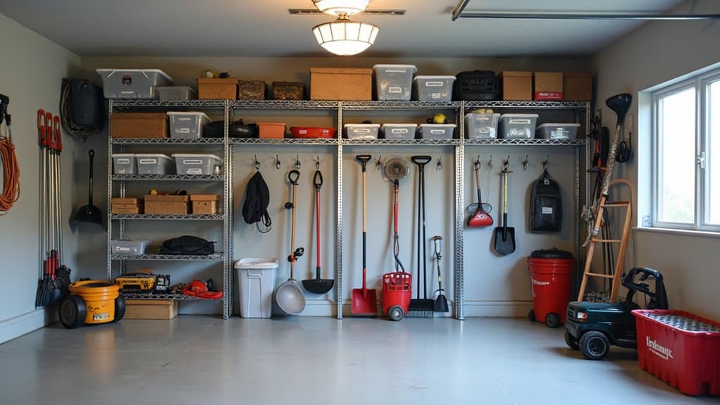 To maintain order, store off-season items in less accessible areas, such as higher shelves or the back of the garage, while keeping current seasonal items within reach. Rotate these items as seasons change to guarantee the most relevant gear is always accessible without disrupting the garage’s overall organization. Adding a simple inventory list or label system for each bin can also help track contents, saving time when searching for specific items.