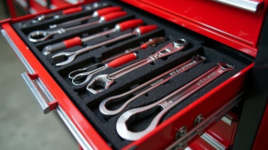 Next, assign specific drawers or compartments for each category of tools to maintain order and easy access. Use drawer liners or foam organizers to keep tools from sliding around and to protect both the tools and the chest. Label each drawer or section clearly, so you can quickly find what you need without rummaging through multiple spots.