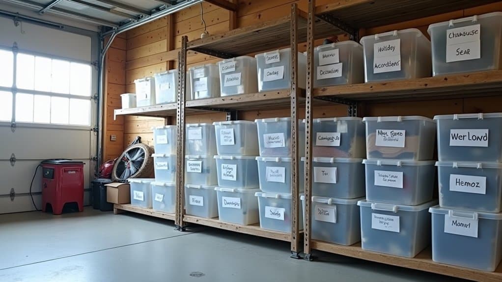 Organizing seasonal items in a three-car garage can greatly enhance space efficiency and ease of access. Start by designating specific zones or shelves for items like holiday decorations, winter gear, or summer sports equipment, guaranteeing they are grouped by season or holiday. Use clear, labeled bins or storage boxes to keep everything contained and easily identifiable, preventing clutter from spreading across the garage.