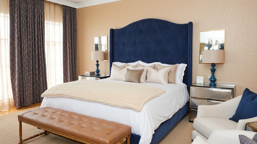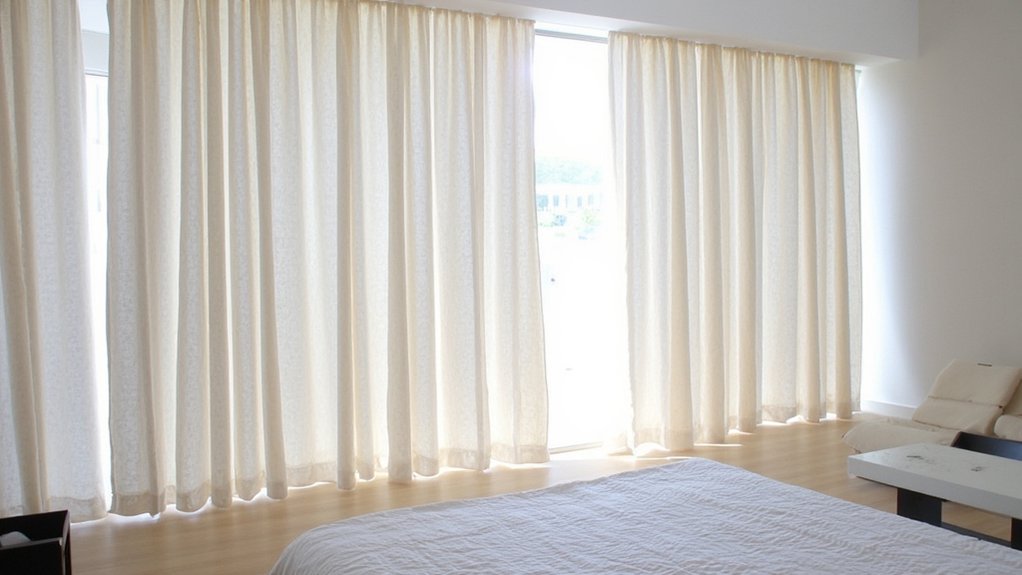 While you’re building that cozy bedroom vibe, consider hanging linen curtain panels to soften the space with natural texture. These panels add a breezy, elegant touch and filter light beautifully. Choose panels about 84-96 inches long to graze the floor, and install them within a day for quick impact.