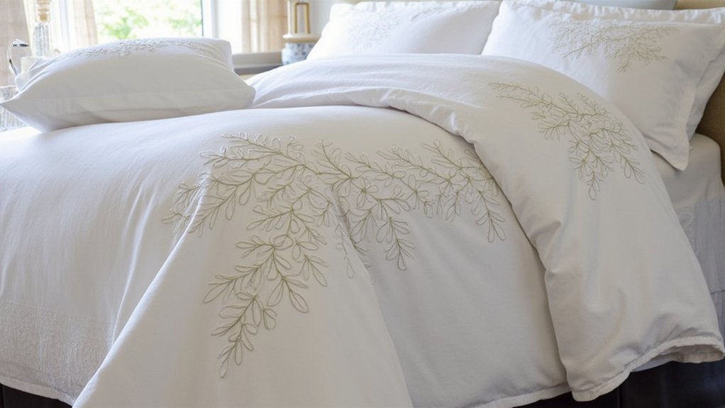 Switch your bedding to an embroidered cotton duvet for a cozy, personal touch in your bedroom. You’ll love how this soft, breathable fabric, often in a standard queen size (90×90 inches), adds subtle texture. It’s perfect for year-round use, keeping you comfy in any season.