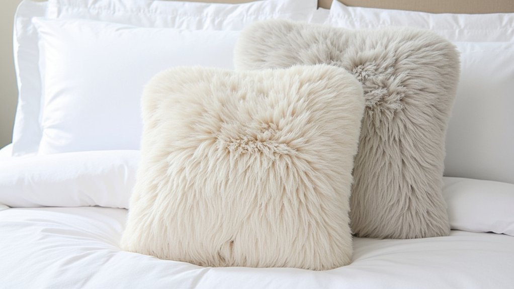 Add a couple of faux fur pillows to your bed for that extra touch of luxury and warmth. These soft, plush accents instantly elevate your bedroom’s coziness while adding texture. Opt for pillows sized around 18×18 inches for a balanced look, and place them in front of your regular pillows.