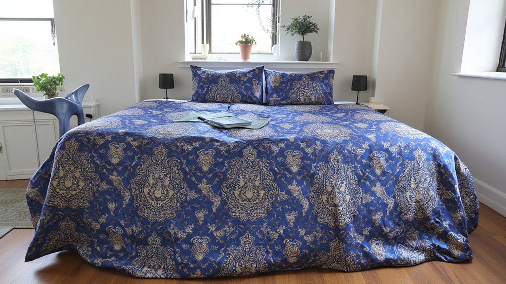 Transform your bedroom into a haven with a patterned silk bedspread that adds elegance and warmth. You’re instantly upgrading the space with a luxurious 90×100-inch cover that’ll drape beautifully over a queen-sized bed.