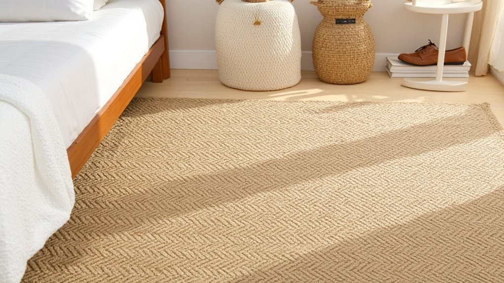 Let’s move from the plush comfort of velvet bedding to another texture that grounds your cozy bedroom vibe. A woven jute rug adds natural warmth and rustic charm underfoot. You’ll love how it contrasts with softer fabrics, balancing your space.