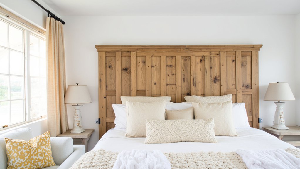 A sturdy rustic wooden headboard can instantly transform your bedroom into a warm, inviting retreat with timeless charm. You’ll love how it adds natural texture with its rough-hewn finish, grounding your space in earthy style. Opt for a king-size headboard, around 80 inches wide by 50 inches tall, to make a bold statement.