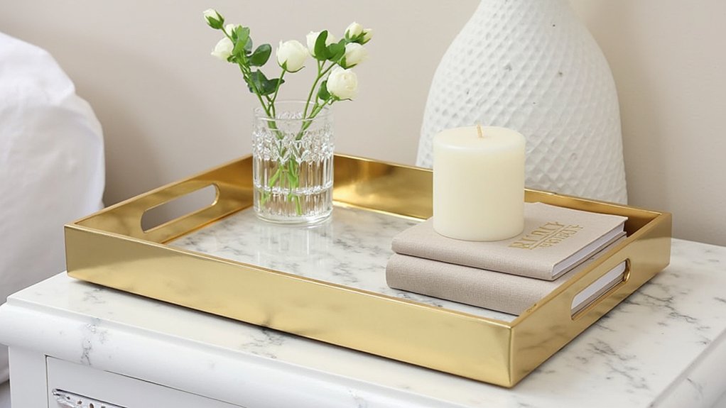 Elevate your bedroom’s cozy vibe with a metallic accent tray that brings a subtle shine to your space. Place it on your nightstand or dresser to hold essentials like jewelry or a small candle. A tray around 12×8 inches works best, adding style without cluttering your area.