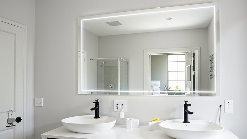 If you’re aiming to boost your guest bathroom’s elegance, installing a sophisticated frameless mirror can make a huge impact. This sleek addition offers a modern, upscale vibe without breaking your budget. You’ll love how it opens up the space, reflecting light for a brighter feel.