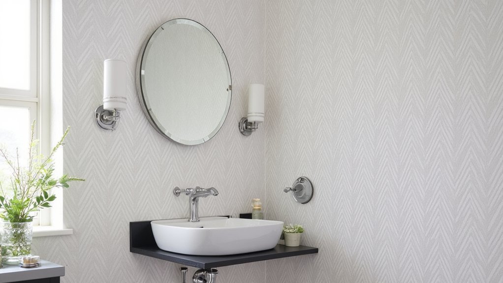 While transforming your guest bathroom, consider adding stylish textured wallpaper to create a bold yet welcoming vibe. It’s an affordable way to elevate the space without breaking the bank. Choose a design that pops, and you’ll instantly upgrade the room’s feel within a few hours.
