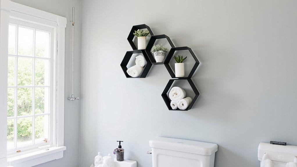 As you upgrade your guest bathroom, think about adding modern geometric shelving for a trendy, functional touch. These shelves, often in hexagonal or triangular shapes, can transform empty walls into stylish storage spots. Install them in about two hours with basic tools.