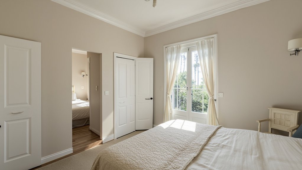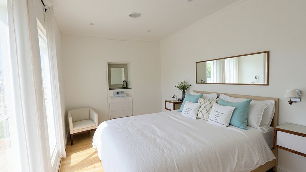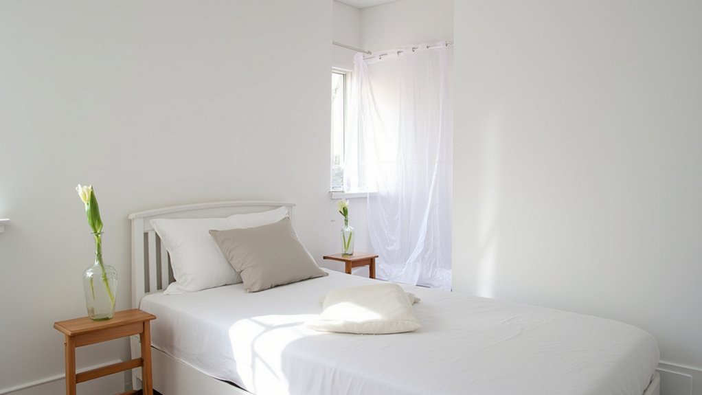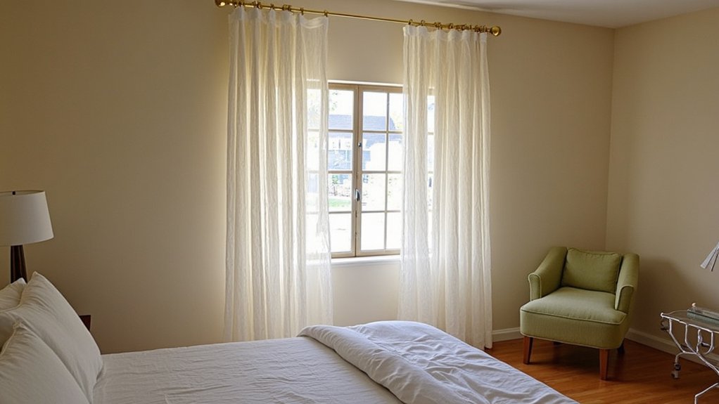 Strategic window dressing can transform your small guest bedroom, and sheer curtains are a perfect solution. They let in natural light, making the room feel airy and bigger while keeping it cozy. Hang them high—about 6 inches above the window frame—to create height. Use a rod that extends 8-12 inches beyond the window on each side for a wider look.
