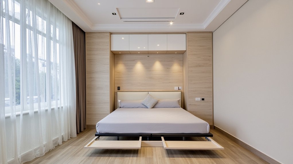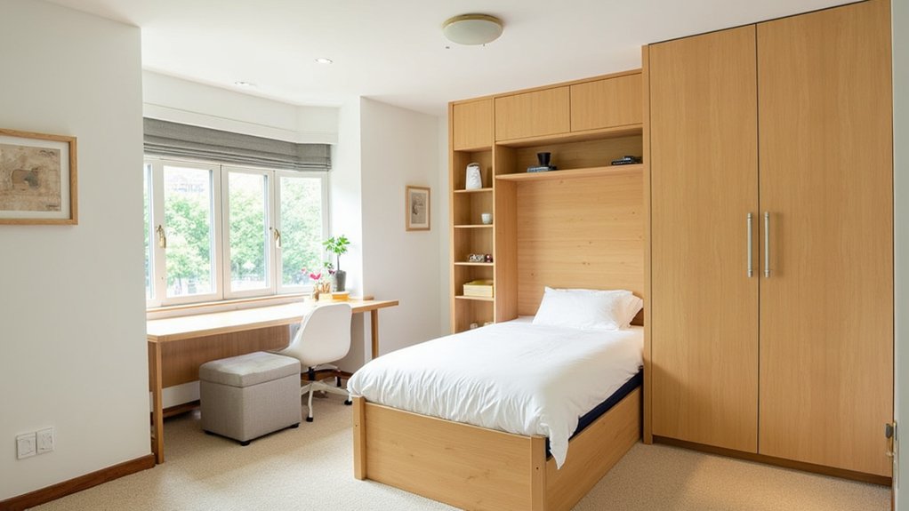 Moving from brightening your space with recessed lighting, let’s focus on maximizing floor area with foldable wall beds. These clever beds, often called Murphy beds, fold up into the wall, freeing up room during the day. You’ll love the extra space for activities or guests in your 10×10-foot bedroom.